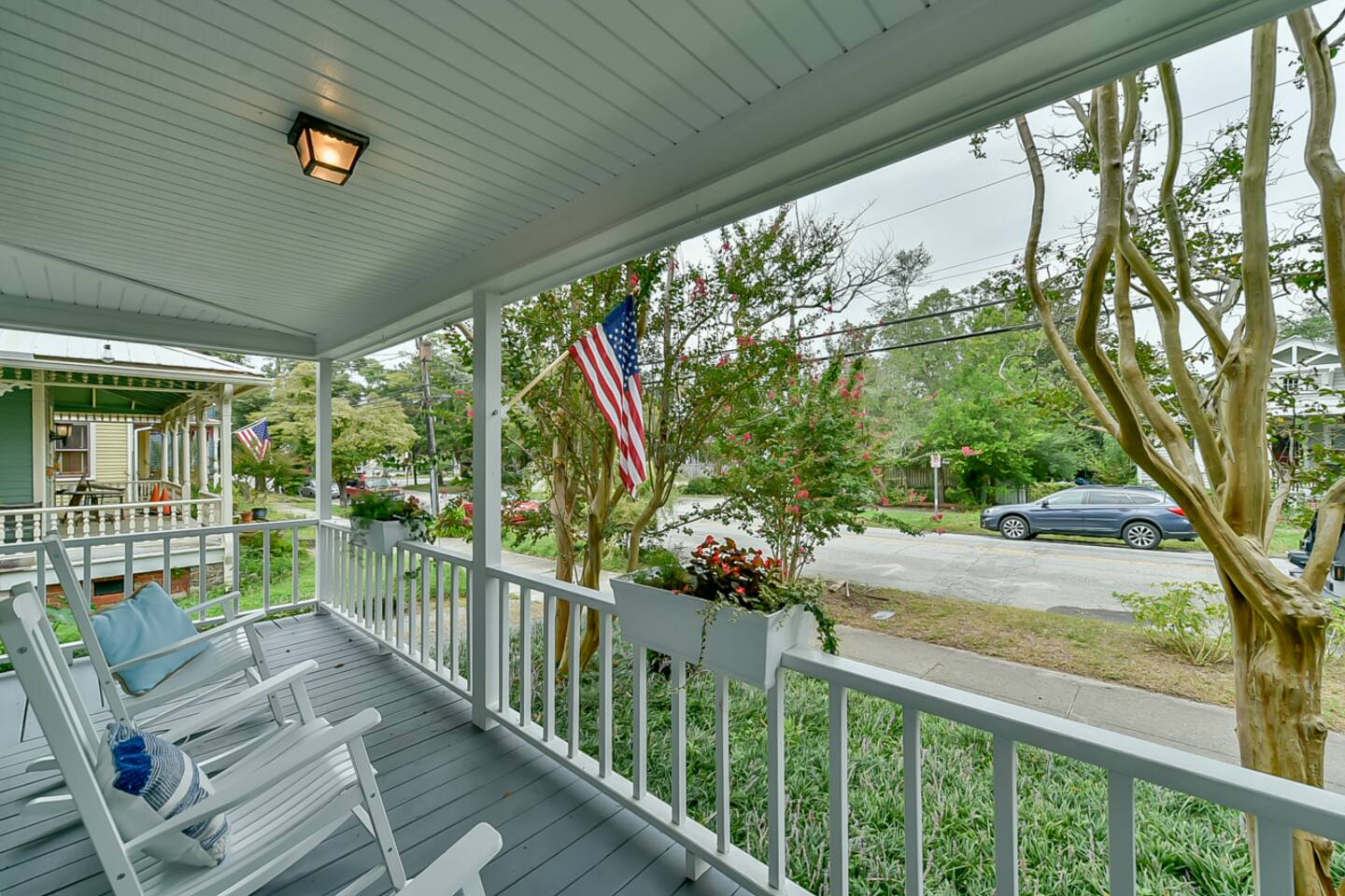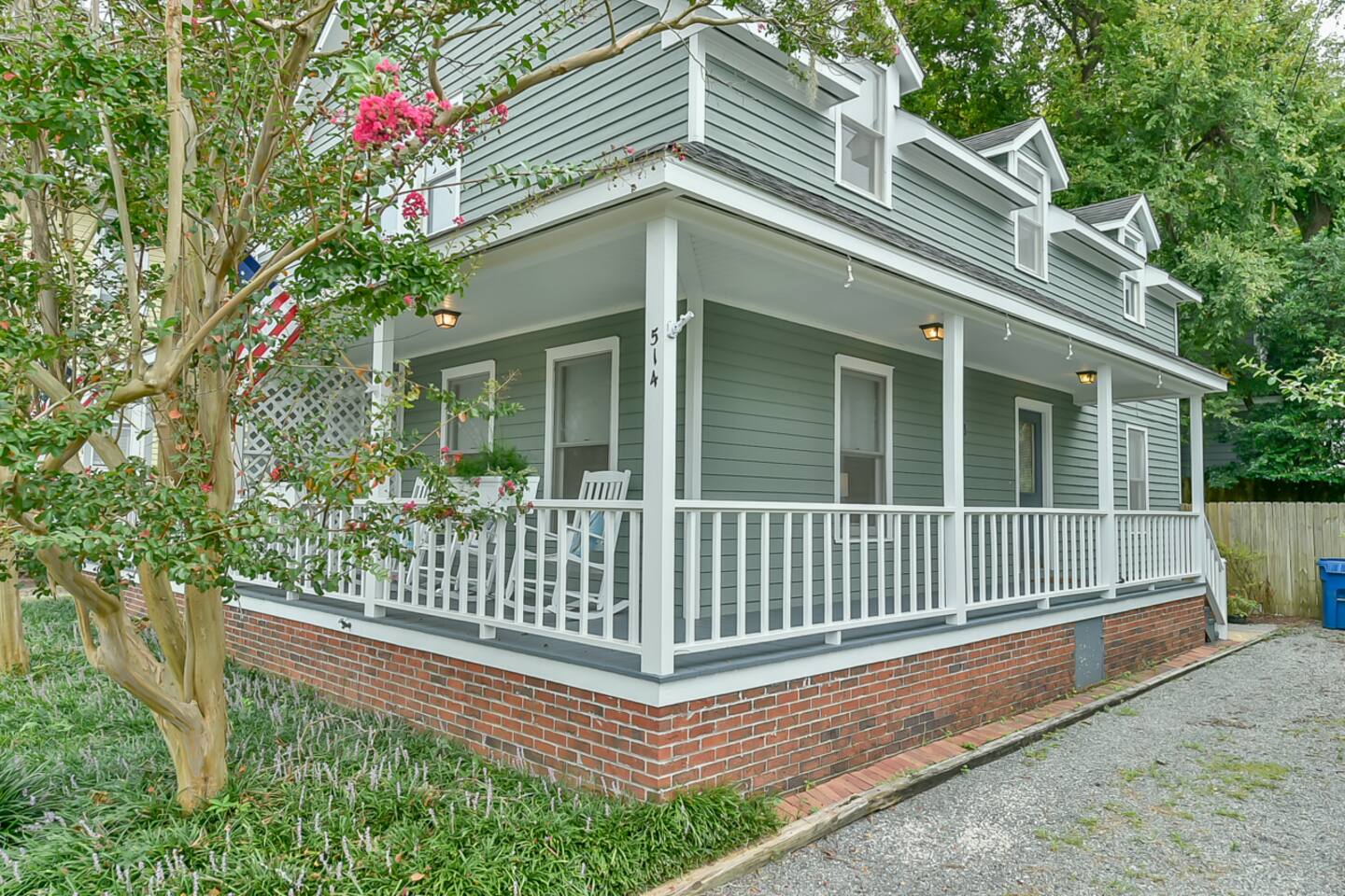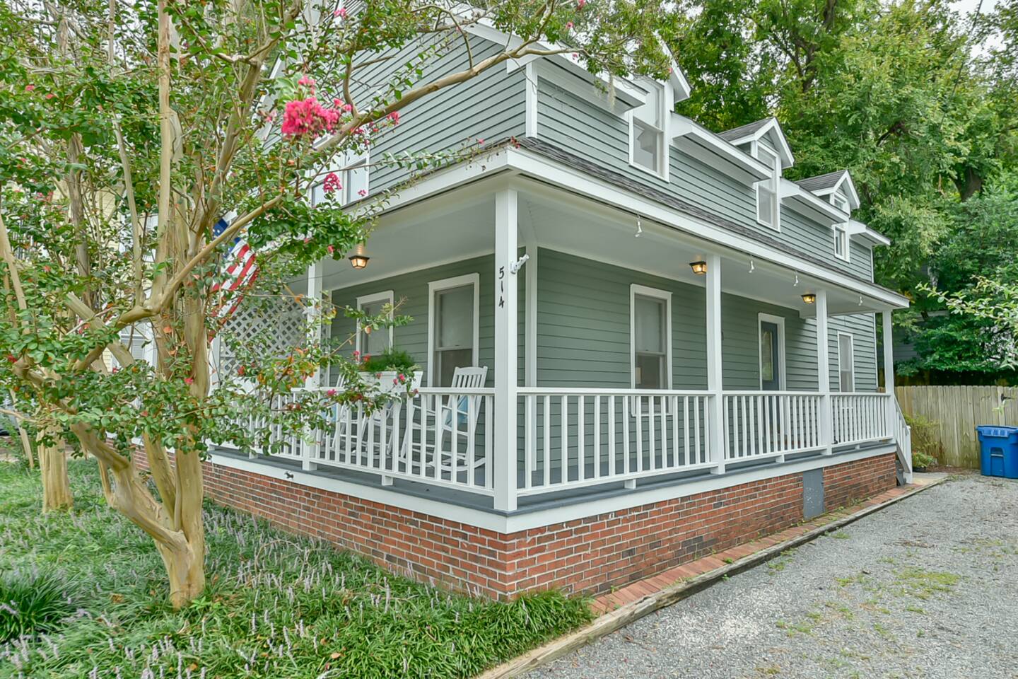 This property is a private full home as one side of a side-by-side duplex, offering rare amenities for Downtown Wilmington including great parking and driveway, private fenced-in backyard area with adirondack chairs, wraparound front porch with rockers. You will not find many properties or rentals downtown with amenities like this. On the main floor, walk in to a refurbished, fresh, and clean space designed for comfort and relaxation. Brand new kitchen remodel with coffee bar, cooking necessities, door to access the back yard and more. Comfortable living room with new smart TV offering the most popular streaming services and select cable channels. Fast >200mbps WiFi. Clean and fresh powder room. Upstairs has 2 large bedrooms, one featuring a comfortable queen bed, and the second with a large king bed and double bed. Perfect fit for a family, group of couples or group of friends. Full bathroom/shower upstairs. Impressive new shower renovation. The biggest attraction to this home is the level of comfort/amenities offered in a full home close to downtown. Located on Dock St, this is as central as it gets. Walk 3-4 blocks to downtown, and one more to the Riverwalk. Incredible location for a Downtown Wilmington visit. You will struggle to find a reason to drive or Uber anywhere during a stay here. Downtown Wilmington is special in that it offers a rich history, fun vibe and culture - but is also a coastal town. A 15-20 minute drive gets you to the best beaches NC has to offer, including Wrightsville Beach and Carolina Beach. There is no shortage of fun activities!