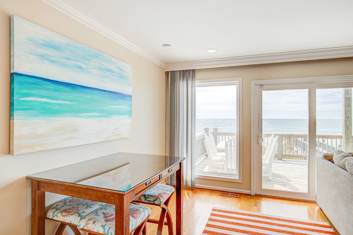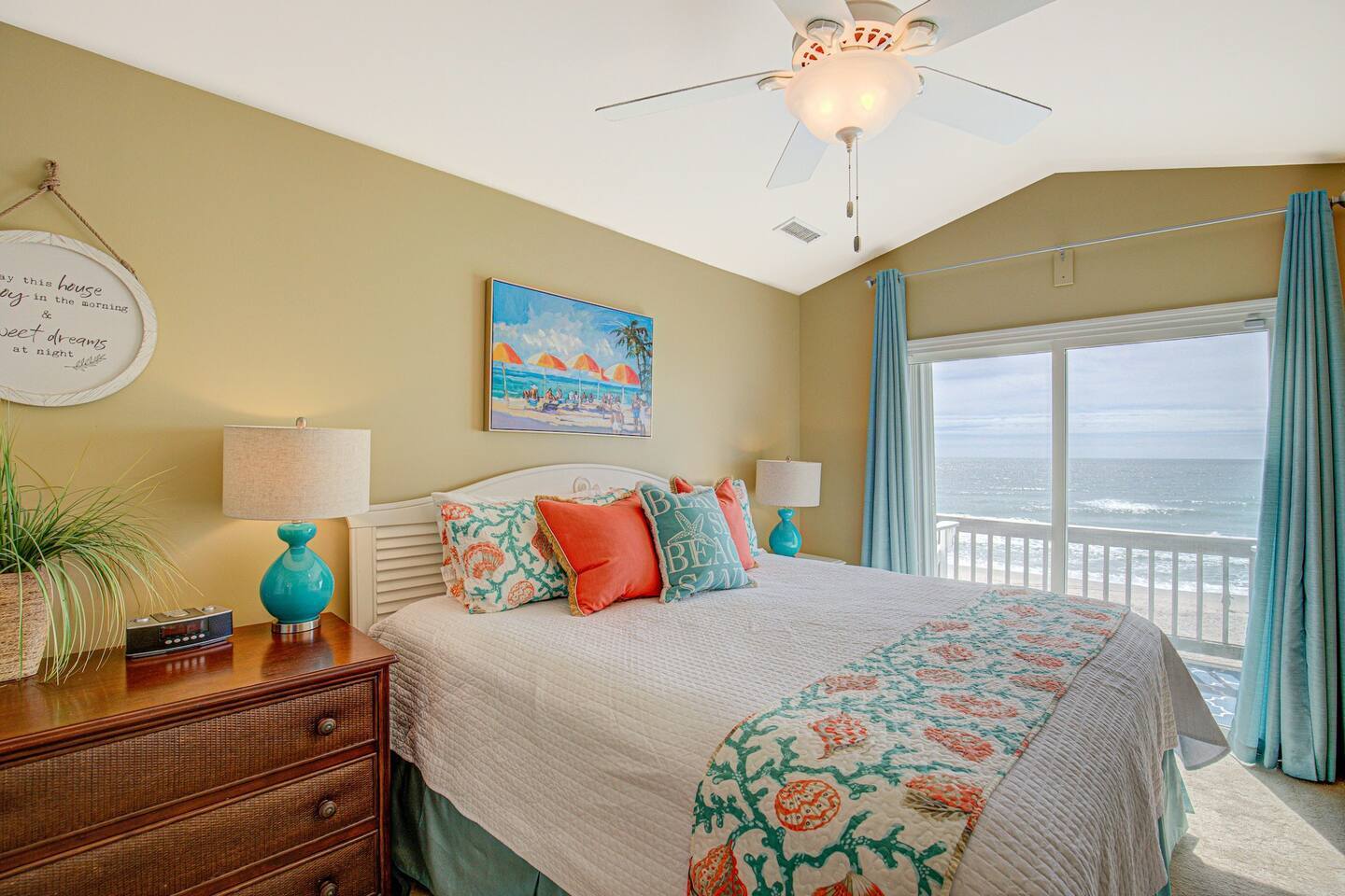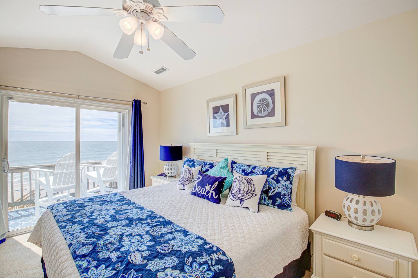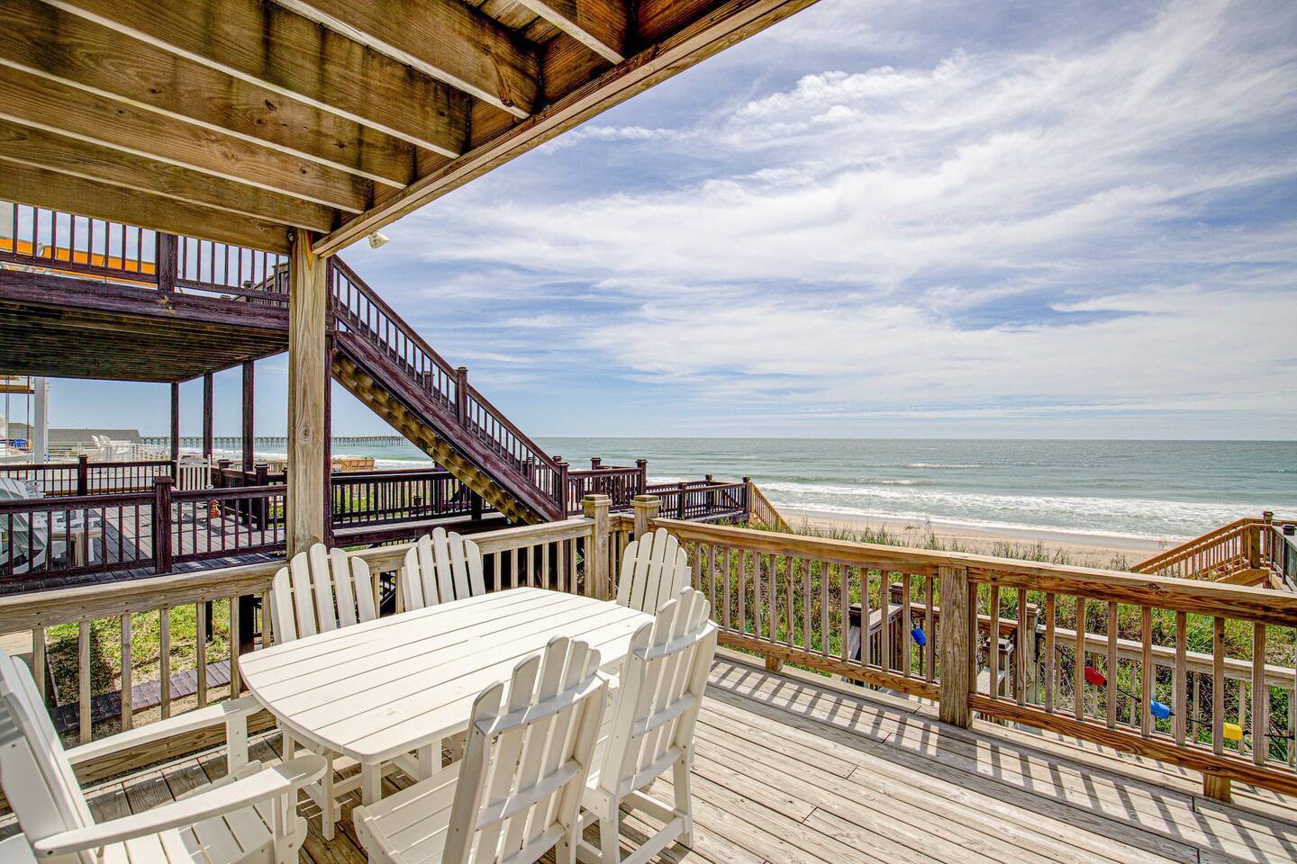 Sittin' in the Sand: A meticulously maintained large (4 bed, 4 full bath) beachfront home located within what locals call the "S-Curve" of Surf City, meaning best-in-class location - walkable to the main attractions on the island, restaurants, bars, and activity centers. Beautifully decorated, airy & spacious, serene views, and loaded with amenities that will make your stay in Surf City a dream vacation. This home provides activities and comfort for the whole family and all ages to enjoy. Seamless entry with key-less front door code makes your arrival a breeze. Bring your personal items + some groceries and everything else is taken care of! Main Level: Enjoy your beautiful ocean views from the kitchen, dining area, and living room, then step outside onto a large private deck with serene views that screams relaxation. There is one large bedroom on the main floor with a king bed and full bathroom which serves as the primary downstairs bathroom. The deck features a beautiful picnic table to enjoy meals by the ocean. Back inside, the kitchen features granite countertops, a dishwasher, a refrigerator with an ice maker and filtered water, an electric glass top stove, a toaster oven, a toaster, a coffee pot, a Keurig, and a crockpot; all perfect for those that love to cook. We provide some cooking basics such as spices, olive oil, sugar, flour, etc are left for your use. Enjoy meals at the dining table that seats over 10. The high top and bar seat an additional four apiece. The den area has a large sofa and comfy chairs to relax in. SMART TV AND WIFI for all your streaming or working needs. You may also watch from the collection of DVDs, play games and do puzzles, or read and magazines books from our selection. The laundry is located on the main floor. Upstairs: Upstairs features three thoughtfully decorated and comfortable bedrooms. Two primary oceanfront bedrooms provide luxurious private spaces for couples or friends, each with a private en suite bathroom and a private entry to the 2nd floor oceanfront balcony with seating for four. This top level balcony is great for quietly enjoying morning coffee and watching the dolphins. A third, very large bedroom features 2 sets of bunk beds (4 single beds), and a queen bed, and also features another full bathroom. This room can sleep up to 6 people, perfect for large families with kids or groups of friends. All bathrooms are stocked with some basic amenities including toilet tissue, soaps, hairdryers. Garage Level: After a day on the beach, enjoy the large outdoor private shower on the ground floor beneath the ocean view decks. We ask that you always rinse off your sandy feet at the hose or shower before entering the house! The lower level painted garage features many amenities including a full sized ping pong table with paddles and balls, a full-sized refrigerator for extra drinks or food during your stay, a collection of beach amenities such as chairs, boogie boards, and more.