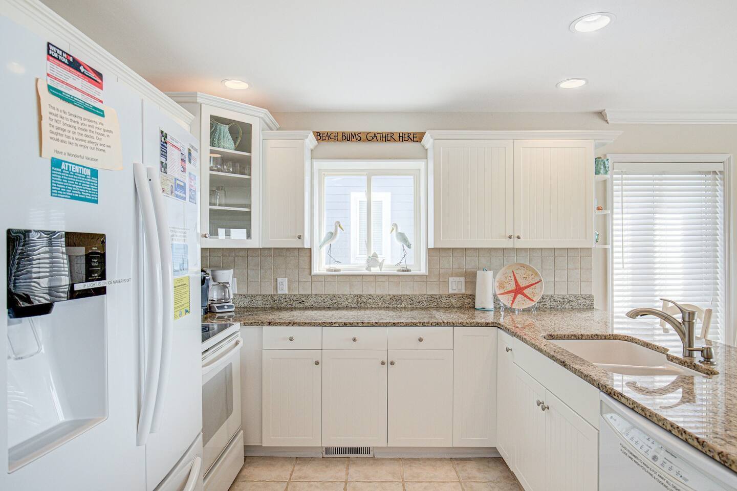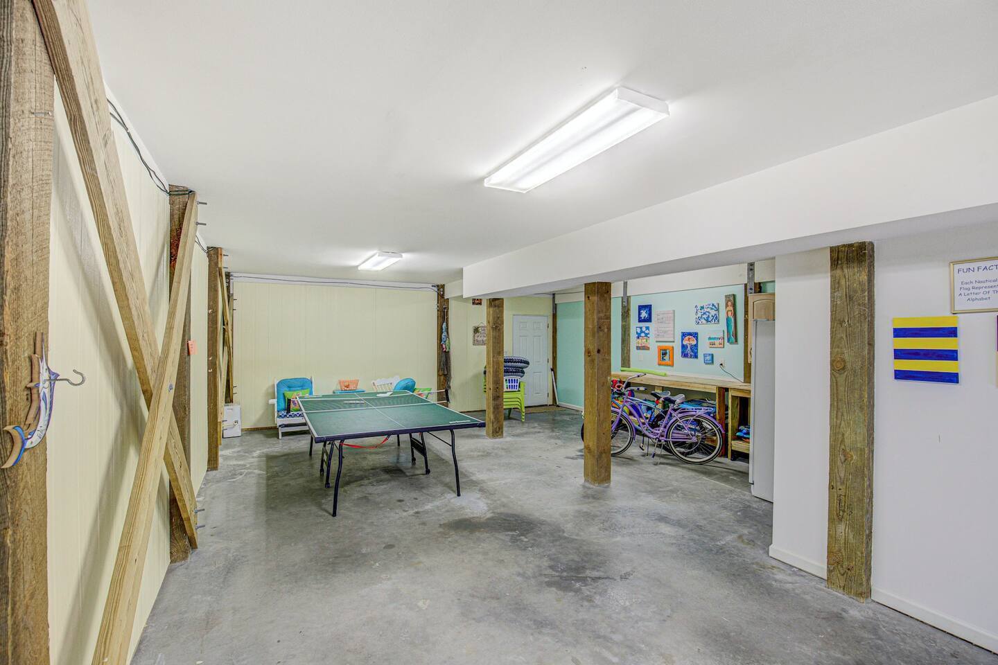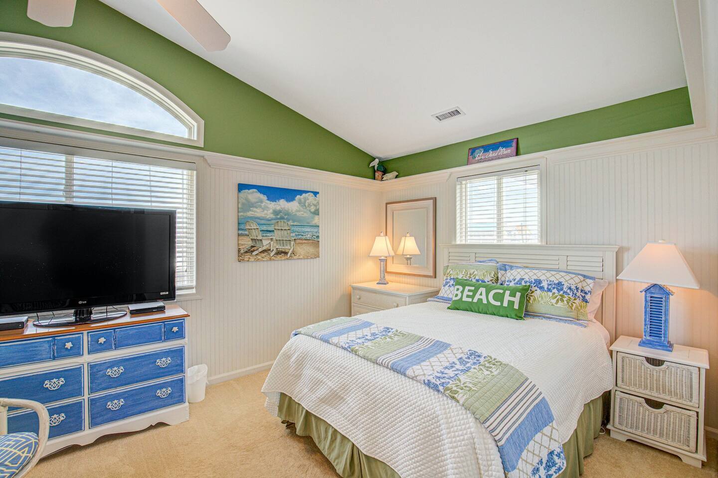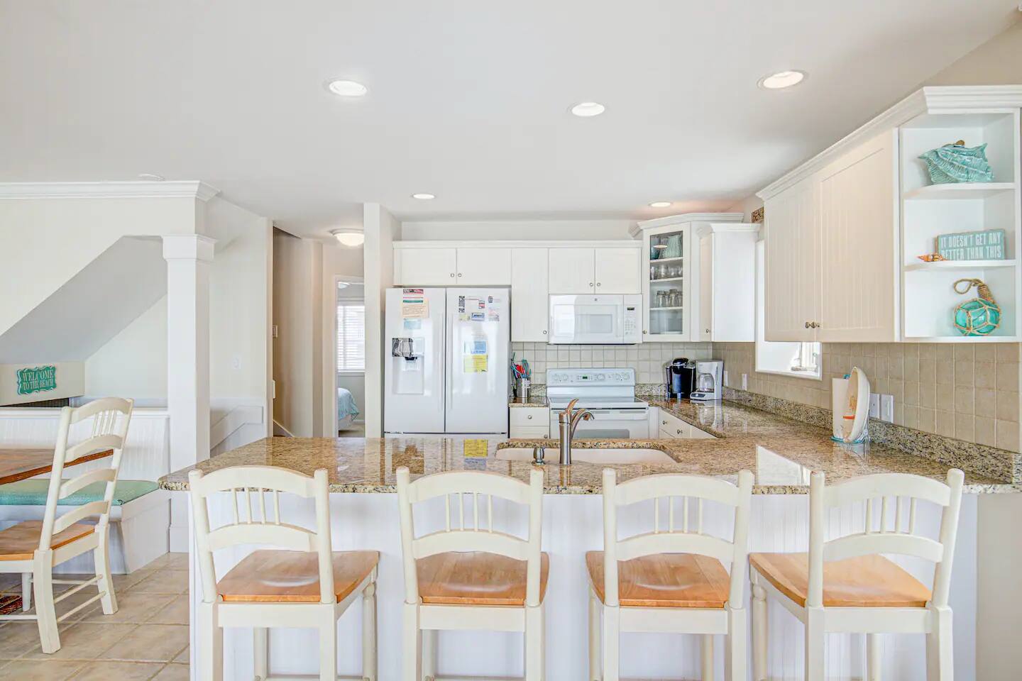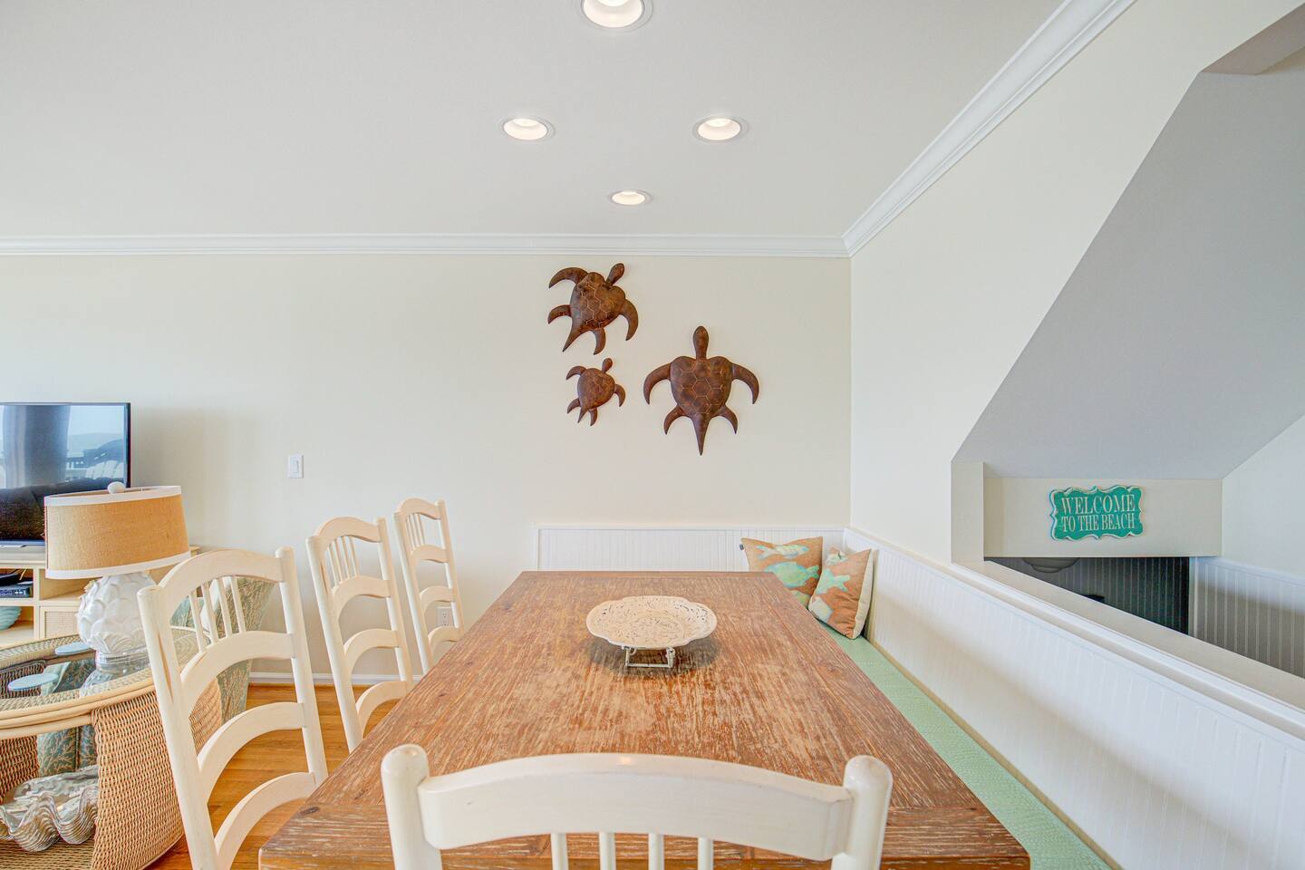 Sittin' in the Sand: A meticulously maintained large (4 bed, 4 full bath) beachfront home located within what locals call the "S-Curve" of Surf City, meaning best-in-class location - walkable to the main attractions on the island, restaurants, bars, and activity centers. Beautifully decorated, airy & spacious, serene views, and loaded with amenities that will make your stay in Surf City a dream vacation. This home provides activities and comfort for the whole family and all ages to enjoy. Seamless entry with key-less front door code makes your arrival a breeze. Bring your personal items + some groceries and everything else is taken care of! Main Level: Enjoy your beautiful ocean views from the kitchen, dining area, and living room, then step outside onto a large private deck with serene views that screams relaxation. There is one large bedroom on the main floor with a king bed and full bathroom which serves as the primary downstairs bathroom. The deck features a beautiful picnic table to enjoy meals by the ocean. Back inside, the kitchen features granite countertops, a dishwasher, a refrigerator with an ice maker and filtered water, an electric glass top stove, a toaster oven, a toaster, a coffee pot, a Keurig, and a crockpot; all perfect for those that love to cook. We provide some cooking basics such as spices, olive oil, sugar, flour, etc are left for your use. Enjoy meals at the dining table that seats over 10. The high top and bar seat an additional four apiece. The den area has a large sofa and comfy chairs to relax in. SMART TV AND WIFI for all your streaming or working needs. You may also watch from the collection of DVDs, play games and do puzzles, or read and magazines books from our selection. The laundry is located on the main floor. Upstairs: Upstairs features three thoughtfully decorated and comfortable bedrooms. Two primary oceanfront bedrooms provide luxurious private spaces for couples or friends, each with a private en suite bathroom and a private entry to the 2nd floor oceanfront balcony with seating for four. This top level balcony is great for quietly enjoying morning coffee and watching the dolphins. A third, very large bedroom features 2 sets of bunk beds (4 single beds), and a queen bed, and also features another full bathroom. This room can sleep up to 6 people, perfect for large families with kids or groups of friends. All bathrooms are stocked with some basic amenities including toilet tissue, soaps, hairdryers. Garage Level: After a day on the beach, enjoy the large outdoor private shower on the ground floor beneath the ocean view decks. We ask that you always rinse off your sandy feet at the hose or shower before entering the house! The lower level painted garage features many amenities including a full sized ping pong table with paddles and balls, a full-sized refrigerator for extra drinks or food during your stay, a collection of beach amenities such as chairs, boogie boards, and more.
