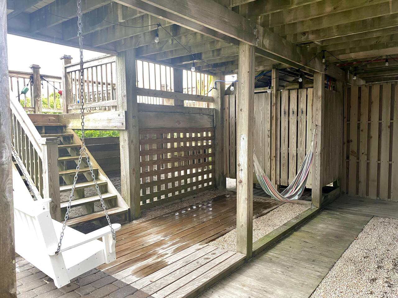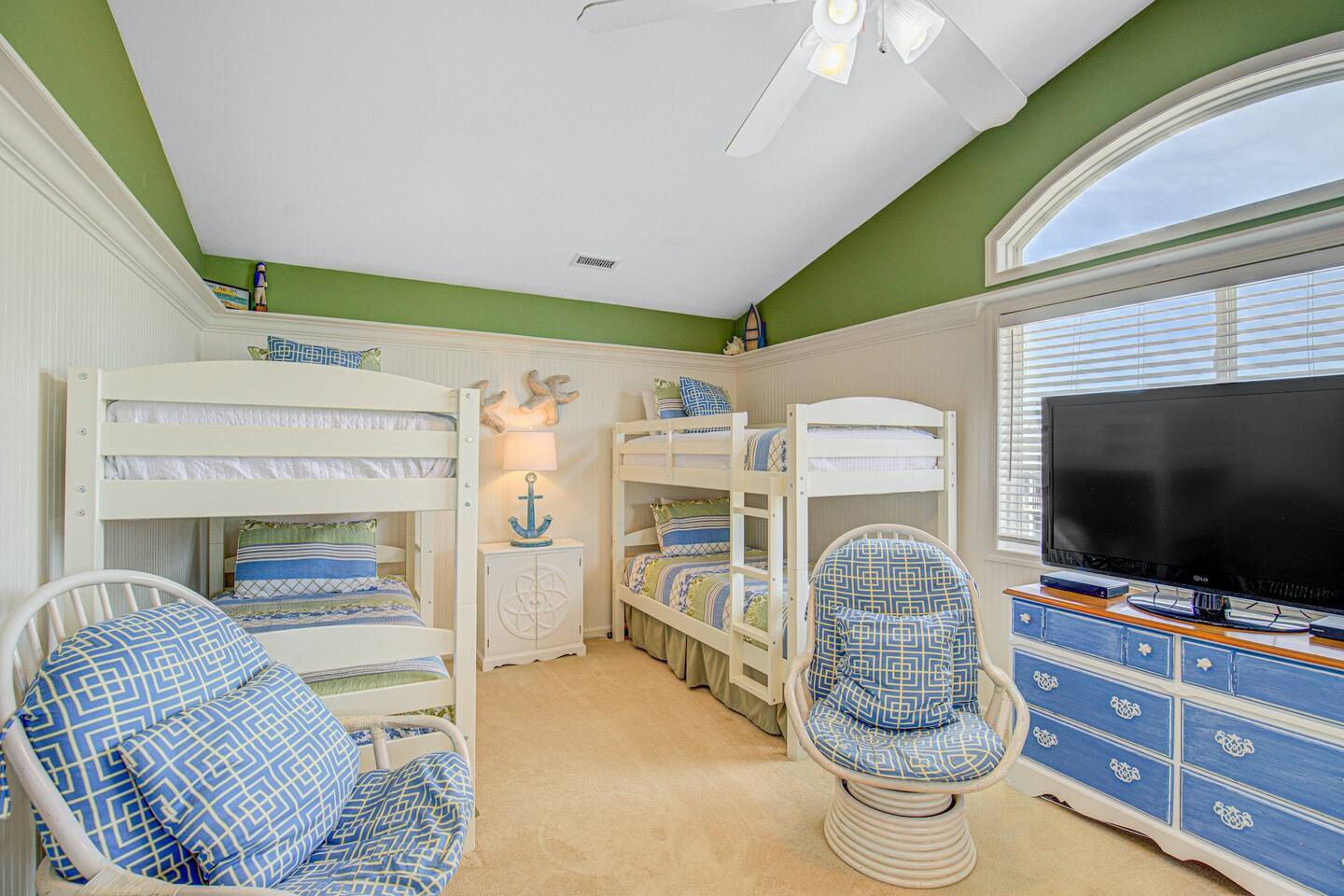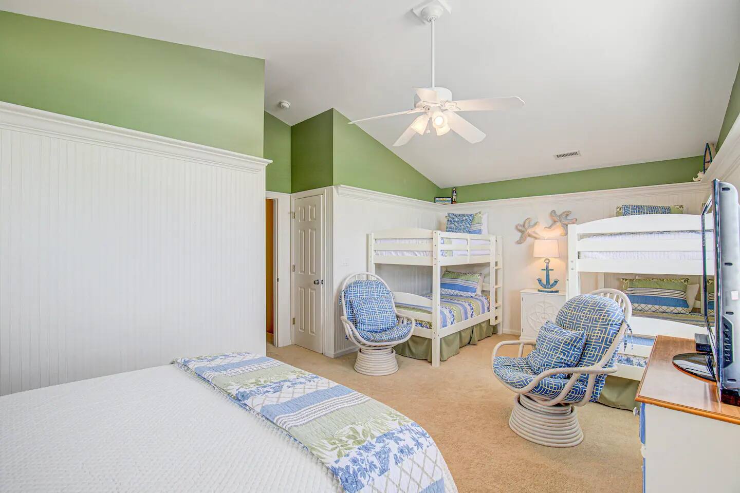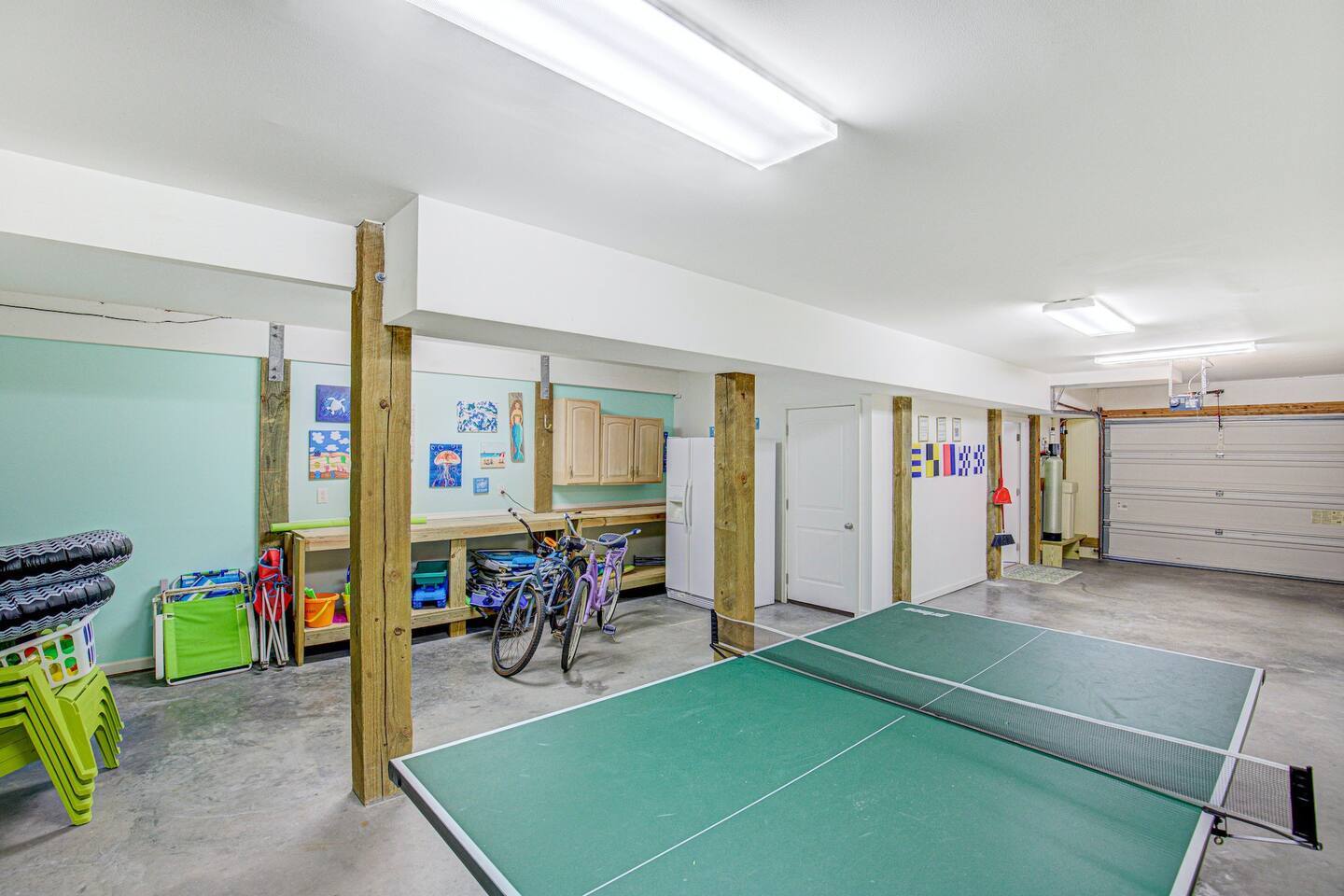 Sittin' in the Sand: A meticulously maintained large (4 bed, 4 full bath) beachfront home located within what locals call the "S-Curve" of Surf City, meaning best-in-class location - walkable to the main attractions on the island, restaurants, bars, and activity centers. Beautifully decorated, airy & spacious, serene views, and loaded with amenities that will make your stay in Surf City a dream vacation. This home provides activities and comfort for the whole family and all ages to enjoy. Seamless entry with key-less front door code makes your arrival a breeze. Bring your personal items + some groceries and everything else is taken care of! Main Level: Enjoy your beautiful ocean views from the kitchen, dining area, and living room, then step outside onto a large private deck with serene views that screams relaxation. There is one large bedroom on the main floor with a king bed and full bathroom which serves as the primary downstairs bathroom. The deck features a beautiful picnic table to enjoy meals by the ocean. Back inside, the kitchen features granite countertops, a dishwasher, a refrigerator with an ice maker and filtered water, an electric glass top stove, a toaster oven, a toaster, a coffee pot, a Keurig, and a crockpot; all perfect for those that love to cook. We provide some cooking basics such as spices, olive oil, sugar, flour, etc are left for your use. Enjoy meals at the dining table that seats over 10. The high top and bar seat an additional four apiece. The den area has a large sofa and comfy chairs to relax in. SMART TV AND WIFI for all your streaming or working needs. You may also watch from the collection of DVDs, play games and do puzzles, or read and magazines books from our selection. The laundry is located on the main floor. Upstairs: Upstairs features three thoughtfully decorated and comfortable bedrooms. Two primary oceanfront bedrooms provide luxurious private spaces for couples or friends, each with a private en suite bathroom and a private entry to the 2nd floor oceanfront balcony with seating for four. This top level balcony is great for quietly enjoying morning coffee and watching the dolphins. A third, very large bedroom features 2 sets of bunk beds (4 single beds), and a queen bed, and also features another full bathroom. This room can sleep up to 6 people, perfect for large families with kids or groups of friends. All bathrooms are stocked with some basic amenities including toilet tissue, soaps, hairdryers. Garage Level: After a day on the beach, enjoy the large outdoor private shower on the ground floor beneath the ocean view decks. We ask that you always rinse off your sandy feet at the hose or shower before entering the house! The lower level painted garage features many amenities including a full sized ping pong table with paddles and balls, a full-sized refrigerator for extra drinks or food during your stay, a collection of beach amenities such as chairs, boogie boards, and more.