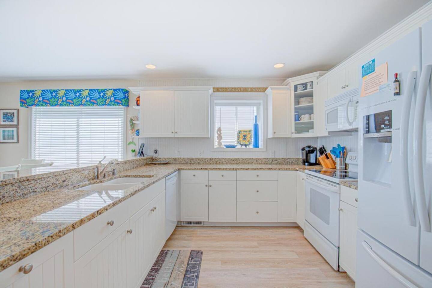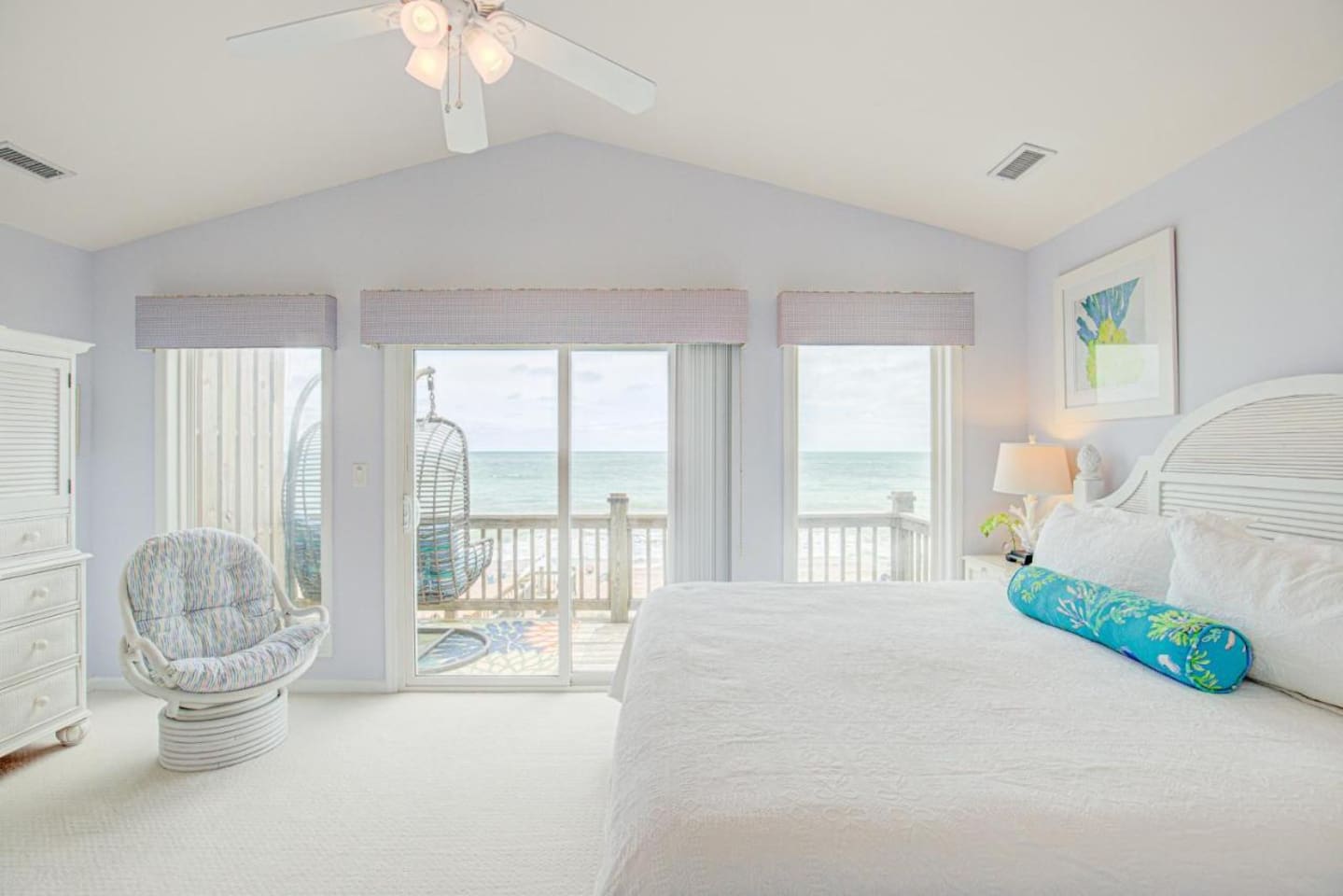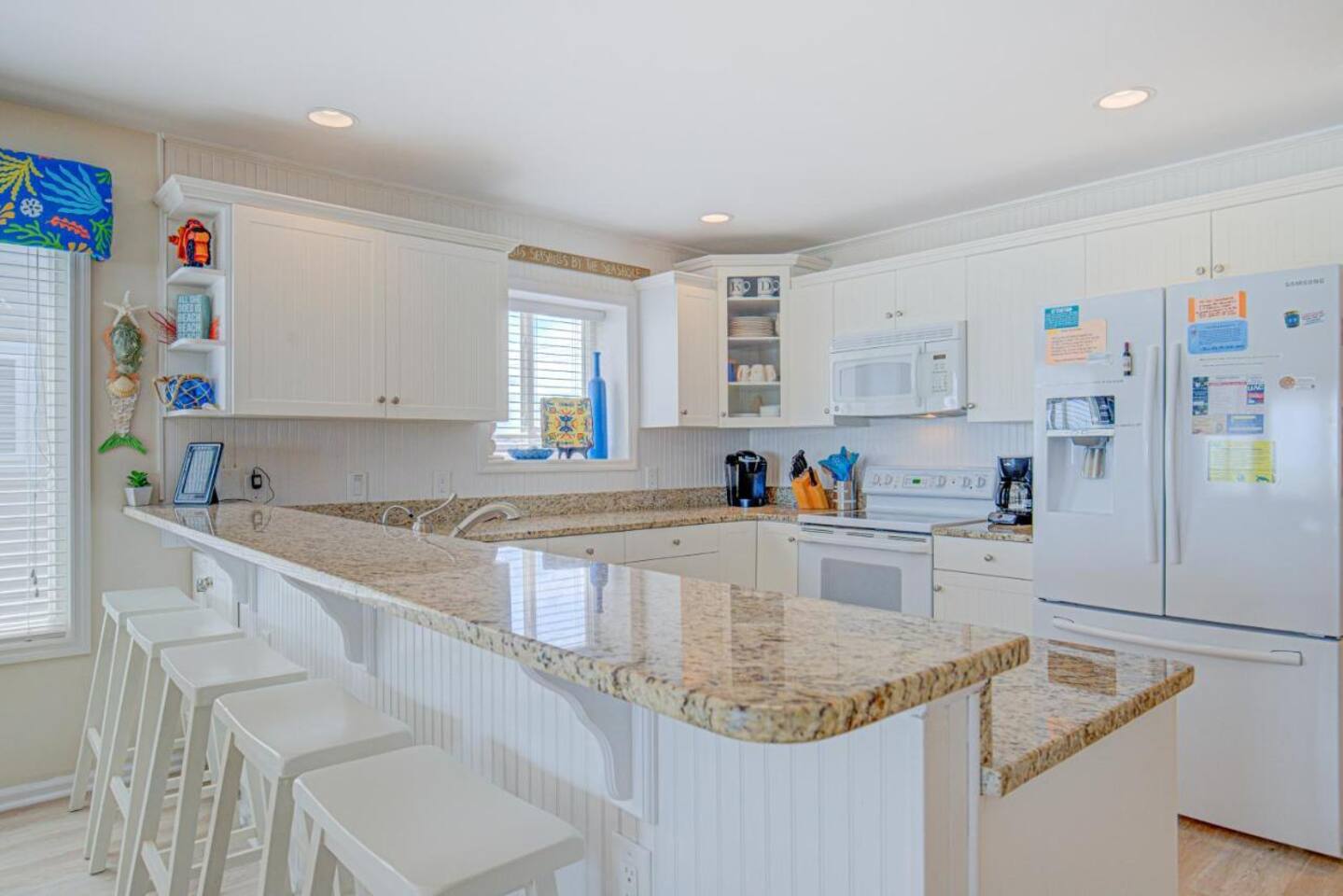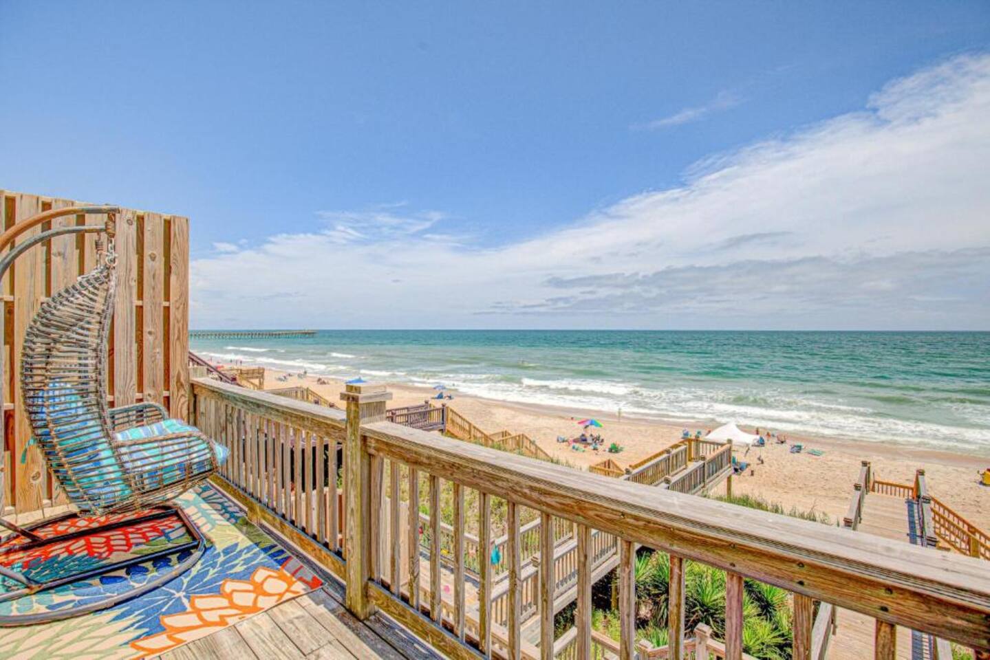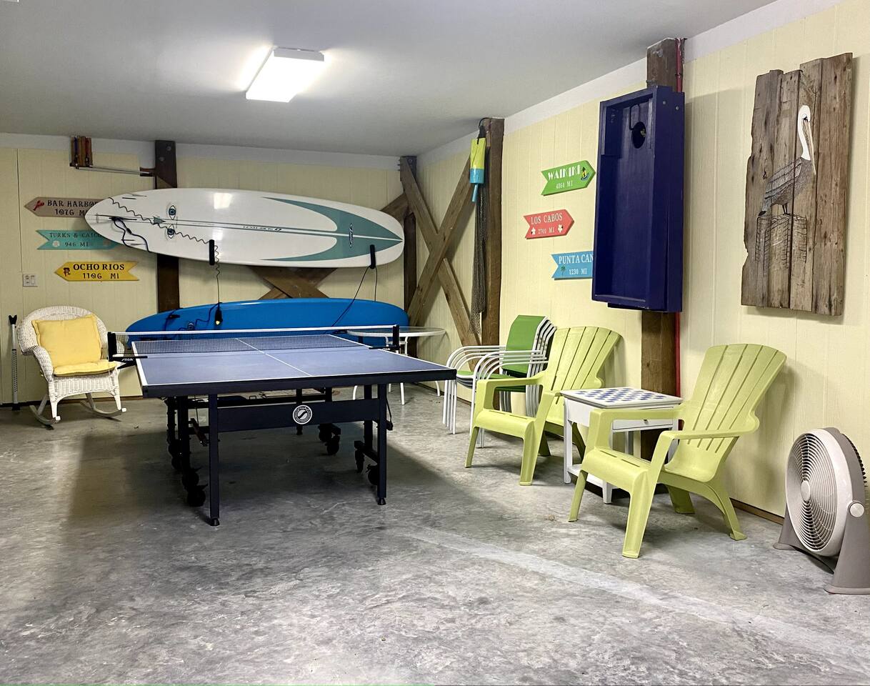 Sittin' in the Sand: A meticulously maintained large (4 bed, 3 full bath) beachfront home located within what locals call the "S-Curve" of Surf City, meaning best-in-class location - walkable to the main attractions on the island, restaurants, bars, and activity centers. Beautifully decorated, airy & spacious, serene views, and loaded with amenities that will make your stay in Surf City a dream vacation. This home provides activities and comfort for the whole family and all ages to enjoy. Seamless entry with key-less front door code makes your arrival a breeze. Bring your personal items + some groceries and everything else is taken care of! Main Level: Enjoy your beautiful ocean views from the kitchen, dining area, and living room, then step outside onto a large private deck with serene views that screams relaxation. There is one bedroom on the main floor with two twin beds and full bathroom which serves as the primary downstairs bathroom. The deck features a beautiful picnic table to enjoy meals by the ocean. Back inside, the kitchen features granite countertops, a dishwasher, a refrigerator with an ice maker and filtered water, an electric glass top stove, a toaster oven, a toaster, a coffee pot, a Keurig, and a crockpot; all perfect for those that love to cook. We provide some cooking basics such as spices, olive oil, sugar, flour, etc are left for your use. Enjoy meals at the dining table that seats over 10. The high top and bar seat an additional four apiece. The den area has a large sofa and comfy chairs to relax in. SMART TV AND WIFI for all your streaming or working needs. You may also watch from the collection of DVDs, play games and do puzzles, or read and magazines books from our selection. The laundry is located on the main floor. Upstairs: Upstairs features three thoughtfully decorated and comfortable bedrooms. A primary oceanfront bedroom provides a luxurious private space for couples or friends featuring a king bed and a private en suite bathroom and private entry to the 2nd floor oceanfront balcony. This top level balcony is great for quietly enjoying morning coffee and watching the dolphins. 2 more comfortable bedrooms upstairs each featuring a king bed and a full bathroom just off the hallway. All bathrooms are stocked with basic amenities including toilet tissue, soaps, hairdryers. Garage Level: After a day on the beach, enjoy the large outdoor private shower on the ground floor beneath the ocean view decks. We ask that you always rinse off your sandy feet at the hose or shower before entering the house! The lower level painted garage features many amenities including a full sized ping pong table with paddles and balls, a full-sized refrigerator for extra drinks or food during your stay, a collection of beach amenities such as chairs, boogie boards, and more.