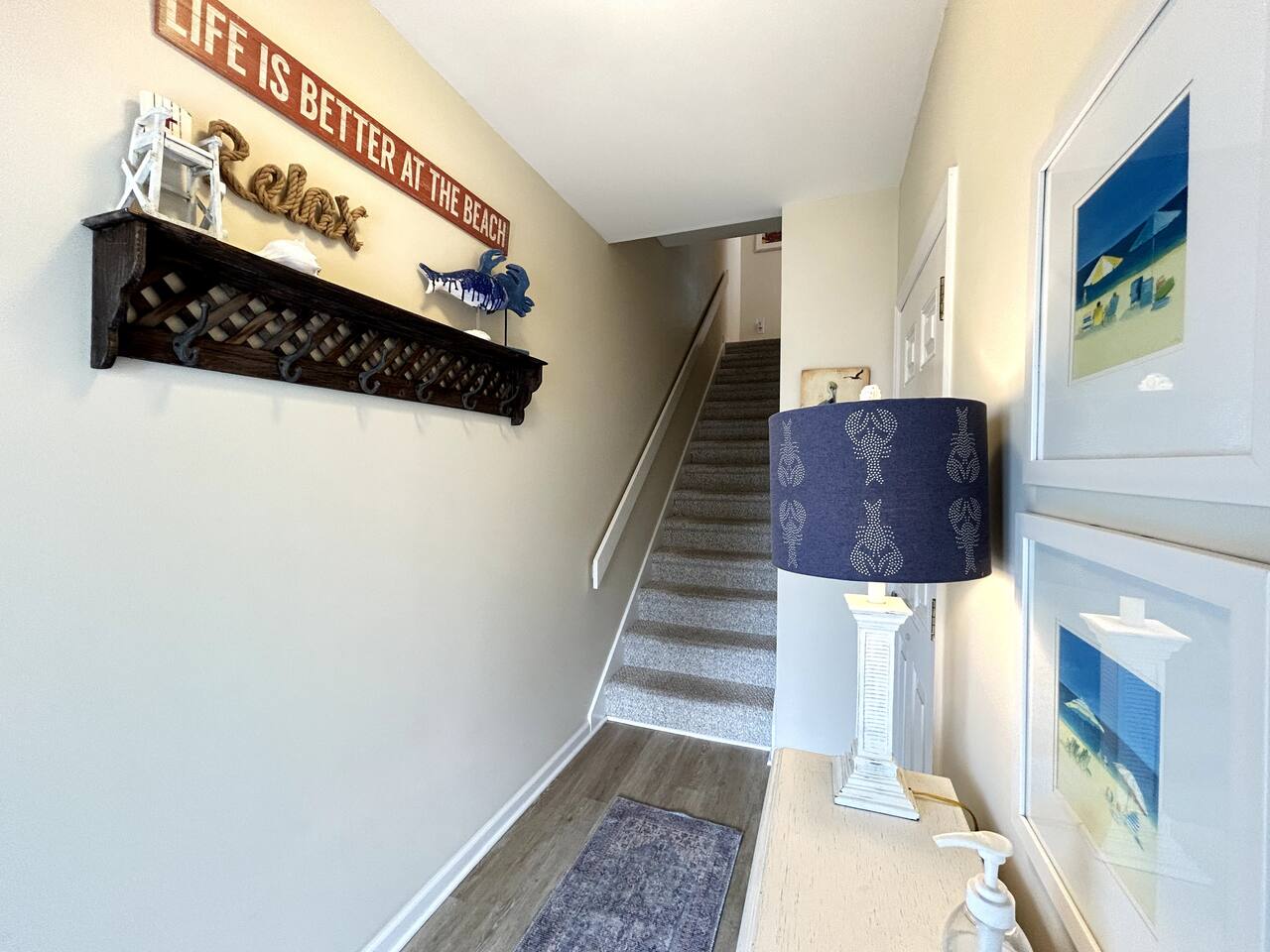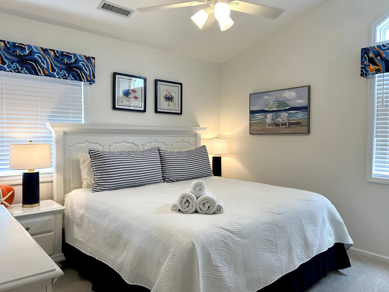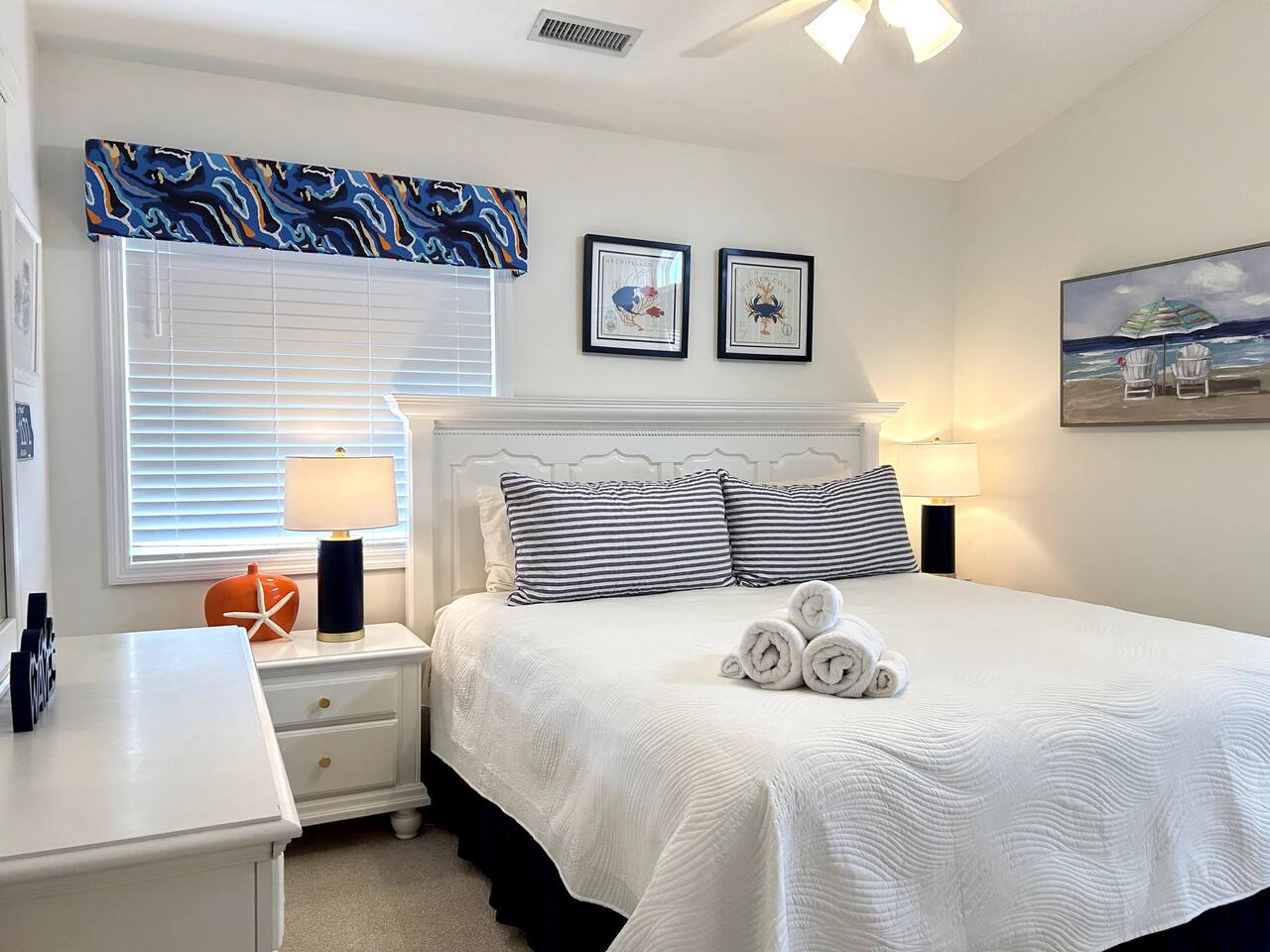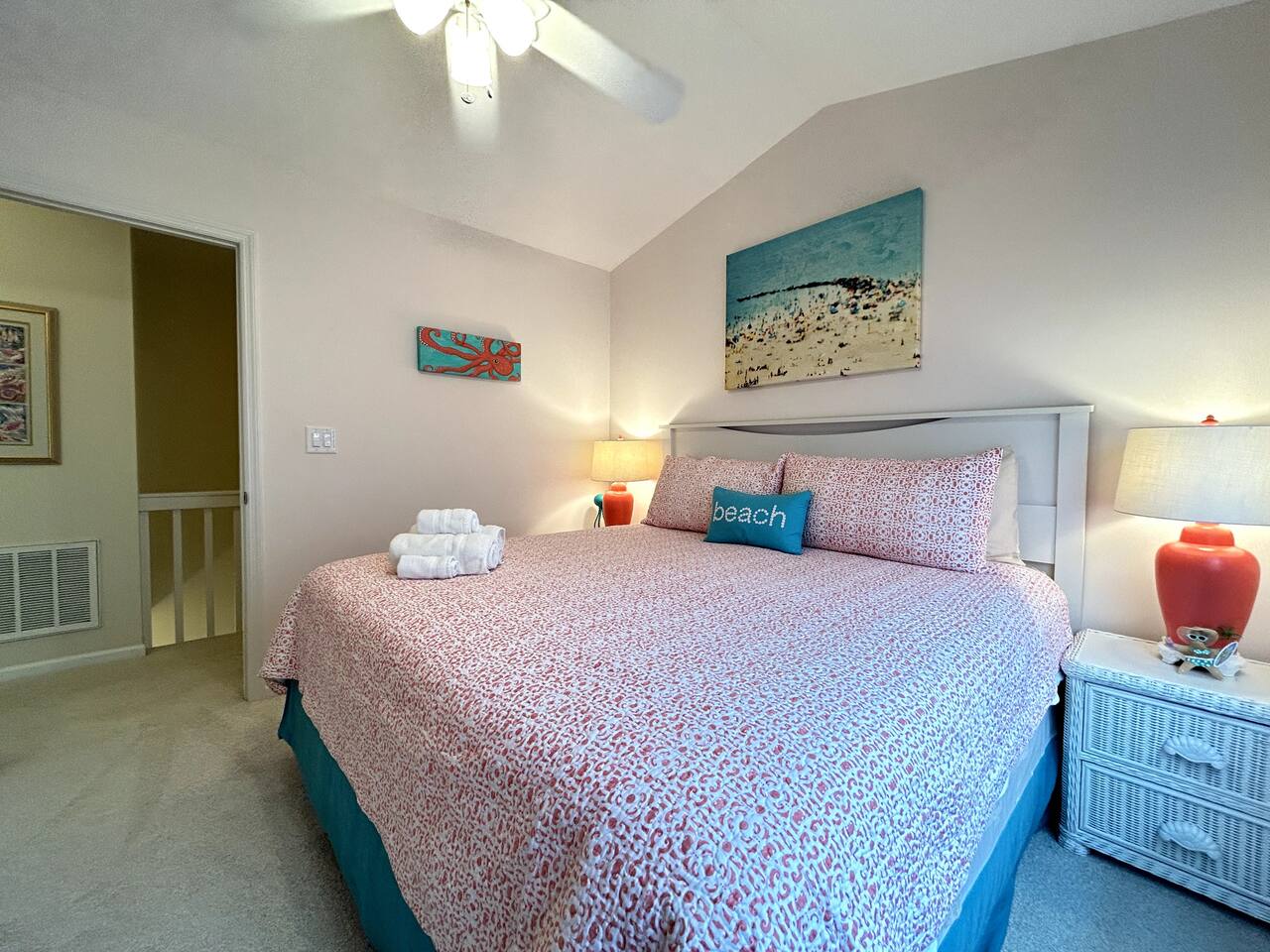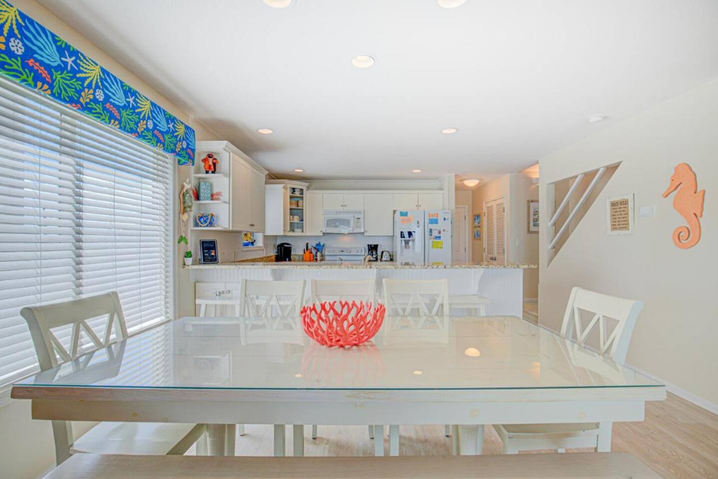 Sittin' in the Sand: A meticulously maintained large (4 bed, 3 full bath) beachfront home located within what locals call the "S-Curve" of Surf City, meaning best-in-class location - walkable to the main attractions on the island, restaurants, bars, and activity centers. Beautifully decorated, airy & spacious, serene views, and loaded with amenities that will make your stay in Surf City a dream vacation. This home provides activities and comfort for the whole family and all ages to enjoy. Seamless entry with key-less front door code makes your arrival a breeze. Bring your personal items + some groceries and everything else is taken care of! Main Level: Enjoy your beautiful ocean views from the kitchen, dining area, and living room, then step outside onto a large private deck with serene views that screams relaxation. There is one bedroom on the main floor with two twin beds and full bathroom which serves as the primary downstairs bathroom. The deck features a beautiful picnic table to enjoy meals by the ocean. Back inside, the kitchen features granite countertops, a dishwasher, a refrigerator with an ice maker and filtered water, an electric glass top stove, a toaster oven, a toaster, a coffee pot, a Keurig, and a crockpot; all perfect for those that love to cook. We provide some cooking basics such as spices, olive oil, sugar, flour, etc are left for your use. Enjoy meals at the dining table that seats over 10. The high top and bar seat an additional four apiece. The den area has a large sofa and comfy chairs to relax in. SMART TV AND WIFI for all your streaming or working needs. You may also watch from the collection of DVDs, play games and do puzzles, or read and magazines books from our selection. The laundry is located on the main floor. Upstairs: Upstairs features three thoughtfully decorated and comfortable bedrooms. A primary oceanfront bedroom provides a luxurious private space for couples or friends featuring a king bed and a private en suite bathroom and private entry to the 2nd floor oceanfront balcony. This top level balcony is great for quietly enjoying morning coffee and watching the dolphins. 2 more comfortable bedrooms upstairs each featuring a king bed and a full bathroom just off the hallway. All bathrooms are stocked with basic amenities including toilet tissue, soaps, hairdryers. Garage Level: After a day on the beach, enjoy the large outdoor private shower on the ground floor beneath the ocean view decks. We ask that you always rinse off your sandy feet at the hose or shower before entering the house! The lower level painted garage features many amenities including a full sized ping pong table with paddles and balls, a full-sized refrigerator for extra drinks or food during your stay, a collection of beach amenities such as chairs, boogie boards, and more.