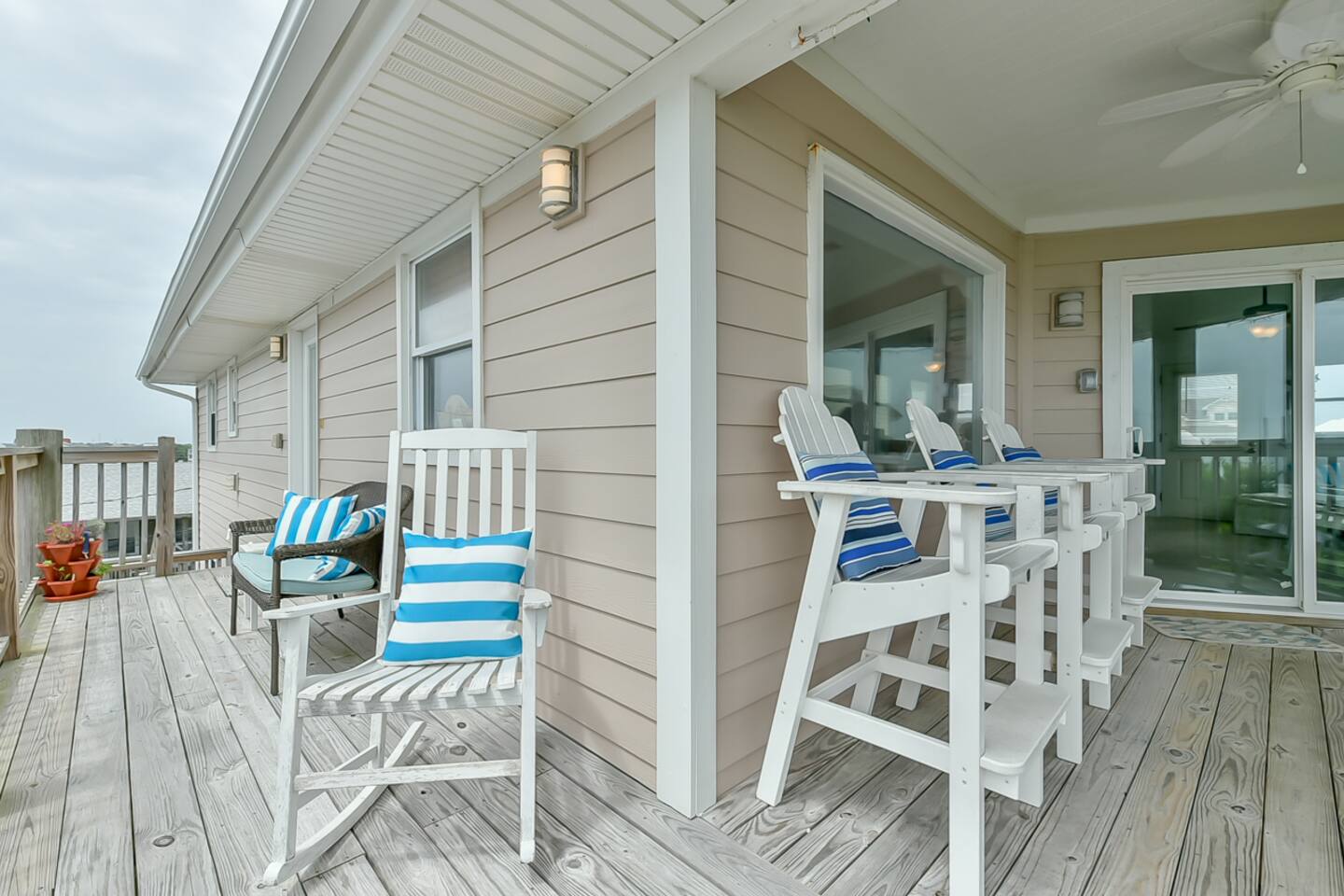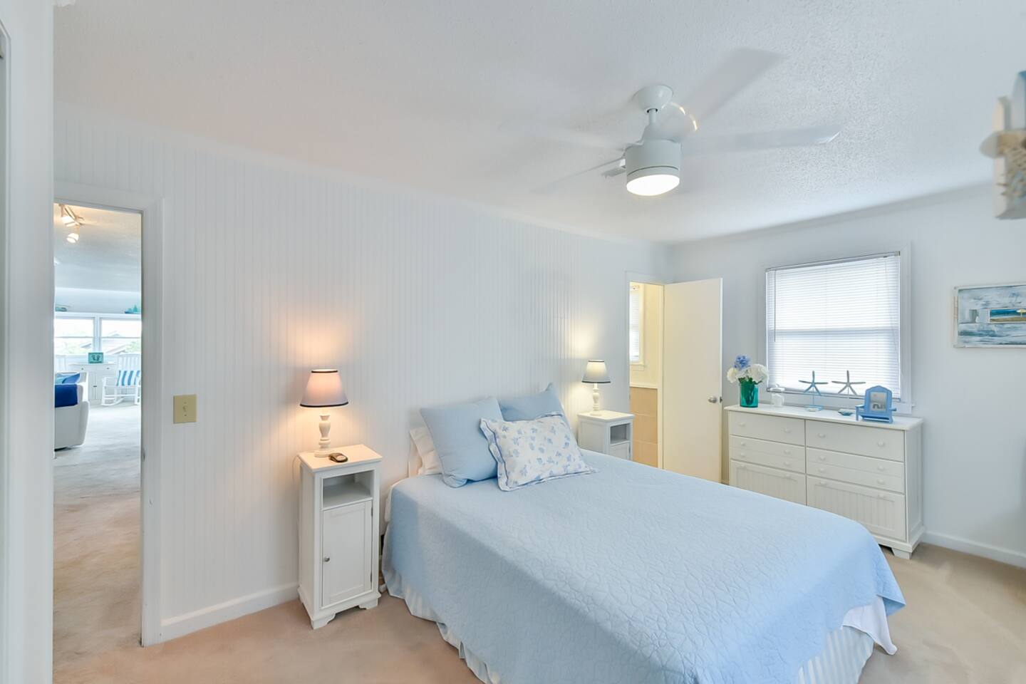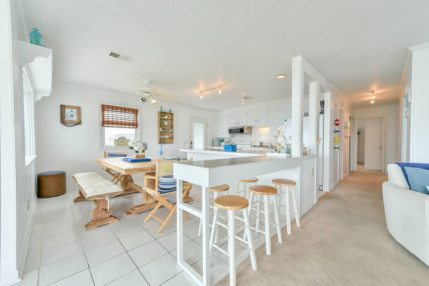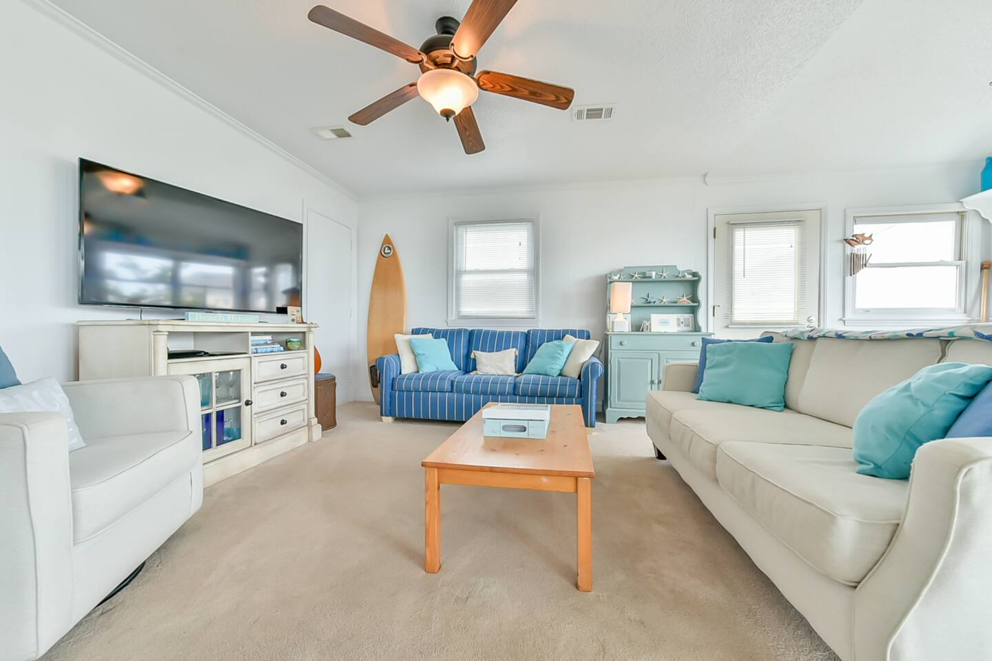 Our home's lot is the highest point on Wrightsville beach which allows for views of both the ocean as well as the sound. Friends call it the "Penthouse" as it takes up the entire top floor of our building. Given the height and elevation, the views are truly remarkable. Our home is located just off the main downtown Wrightsville strip with one of the more popular beach accesses just at the end of our road (~50 yards from our front door). In addition, the proximity to the main restaurants, bars, ice cream shops, local groceries, surf shops, and rental stores all within 100 yards makes this is the most convenient location on the island! We offer up to 3 parking spots for guests. Our home has one of the larger parking areas for a residential home in Wrightsville. It is shared with the 2 lower units, but we provide half of the lot marked with a "3" for our guests. Seamless entry with key-less front door code makes your arrival a breeze. The outdoor shower is refreshing and convenient, available for all guests to use, and we ask that you always rinse off your sandy feet at the hose or shower before entering the house! There are 3 well appointed bedrooms, two with queen beds and the third with a double and a bunk bed for up to 8 total guests, ideal for 2 couples with kids, a large family, or a group of friends. We offer a single memory foam mattress pad for additional sleeping arrangements. The linens are fresh, crisp, and beautifully created around coastal themes, and the pillows and mattresses are comfortable and protected with regularly updated protectors. The well stocked kitchen is ready for you to cook in, and some basics such as spices, olive oil, sugar, flour, etc are left for your use. We allow guests to use the grill - with great caution due to fire hazards - but ask that if you happen to finish the propane tank that you refill/replace it (convenience store to fill the tank is <5 minutes away). The bathrooms are stocked with some basic amenities including toilet tissue, soaps and 2 hairdryers, and there is a first aid kit in the main hallway bathroom closet. You have access to wifi and the living room TV is a smart TV with all the relevant streaming services for your convenience. You may also watch from the collection of DVDs, play games and do puzzles, or read and magazines books from our selection. Bring your personal items + some groceries and everything else is taken care of!